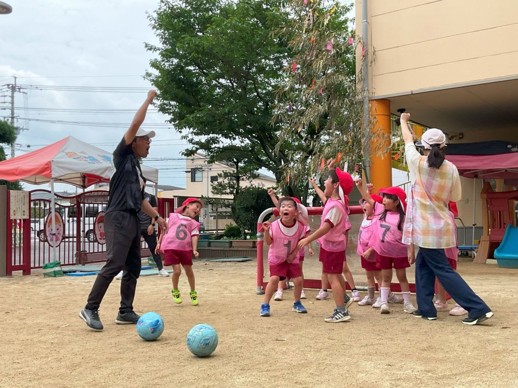ゲームの時には、みんなで必死にゴールを守る姿がありました。みんなで声を掛け合い、どこに転がって行くかわからないボールに翻弄されながらもゴールを目指し、ゴール出来た時は「ゴーール!やったー!」と大喜び!!他のクラスのお友だちも見学しながら、「楽しそう、頑張れー!」と大きな声で声援を送っていました。