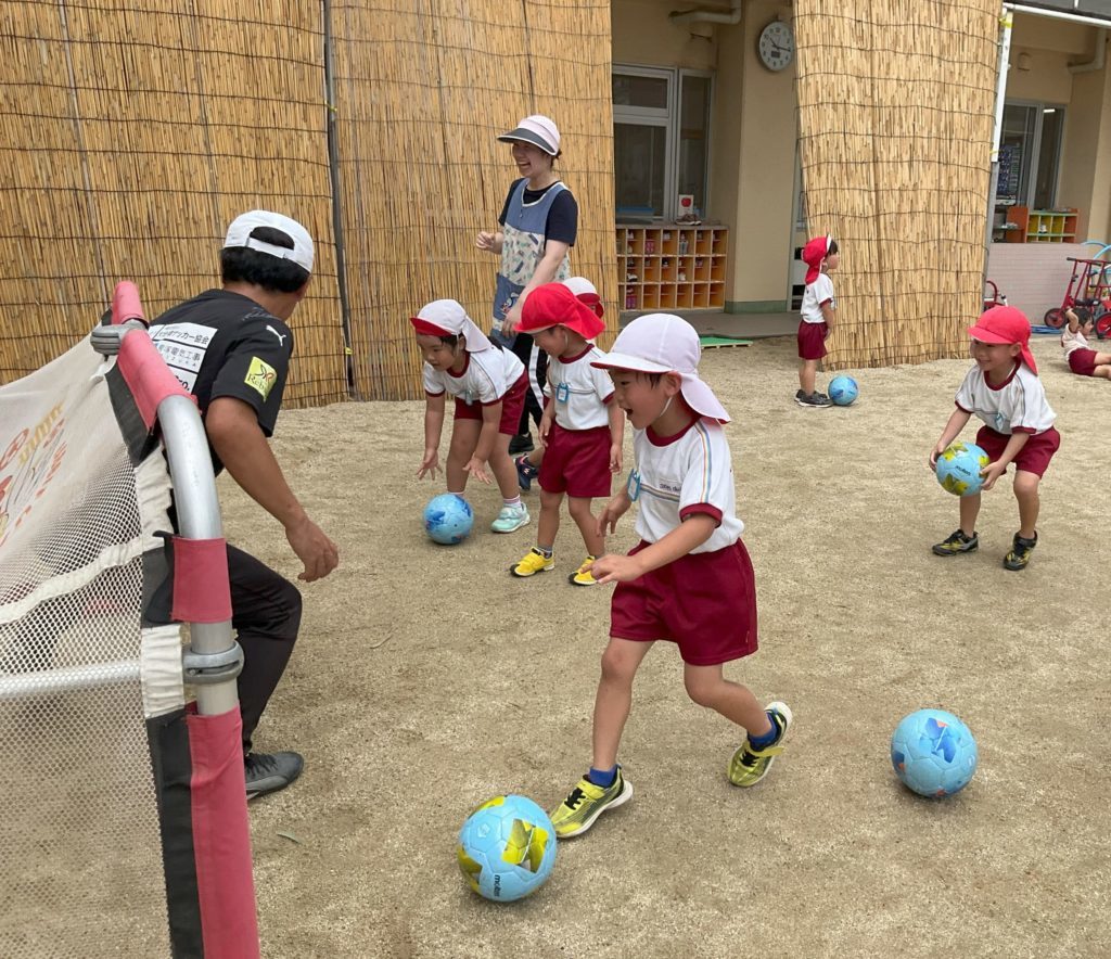 トリニータのコーチに巡回指導して頂き、キッズサッカーを行い4.5歳児クラスが参加しました。