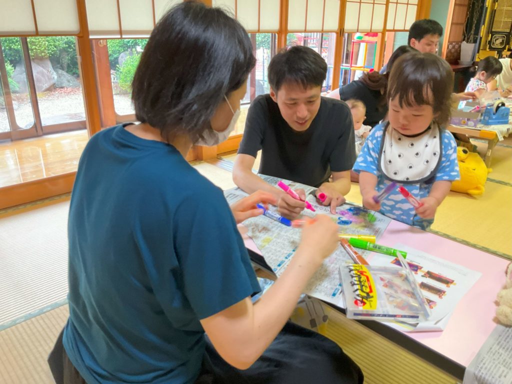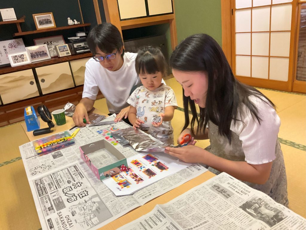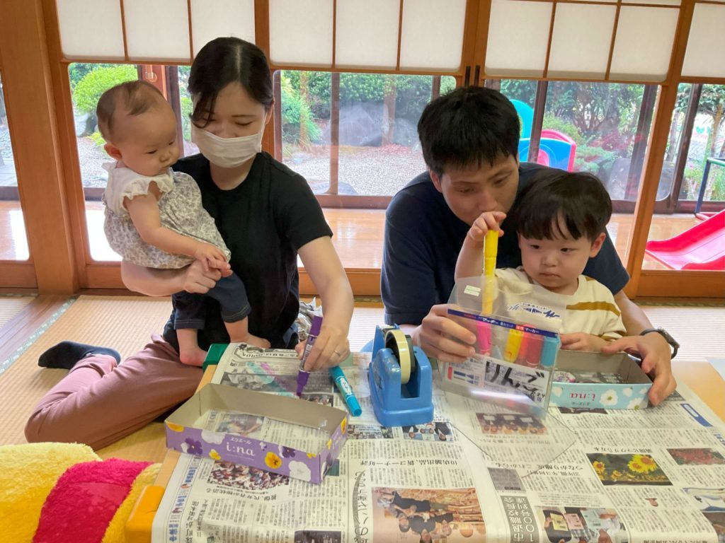 キラキラボックス作りでは、クリアファイルに親子でそれぞれ好きな色を付けていきます。「ここ何色にする?」と言って仲良く話をしながら色塗りをしていました。アルミホイルを丸める時は親子で役割分担して丸めたり、箱の中に並べたりしている家庭もありました。