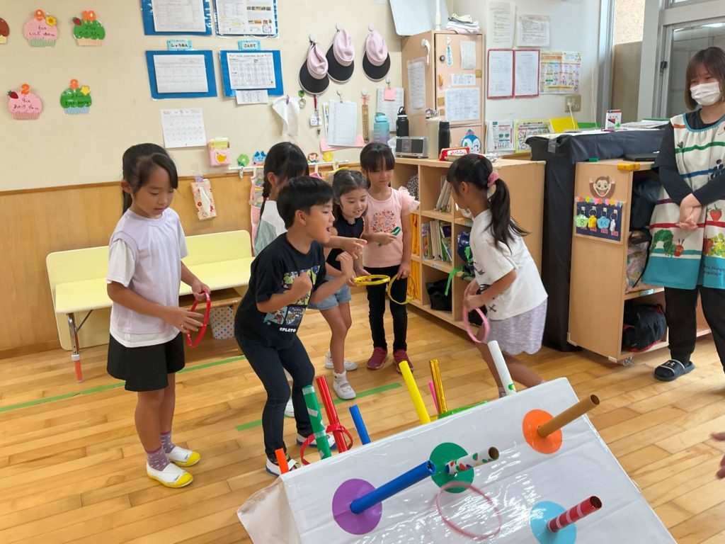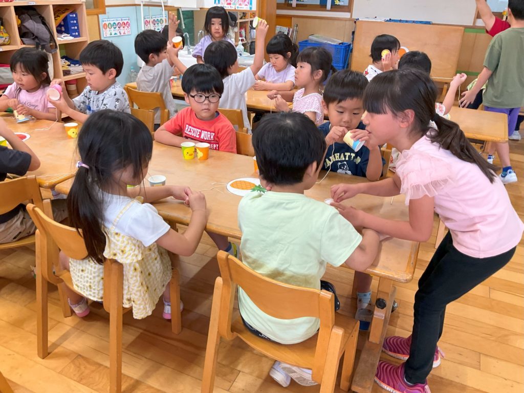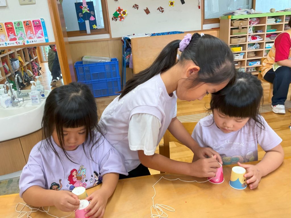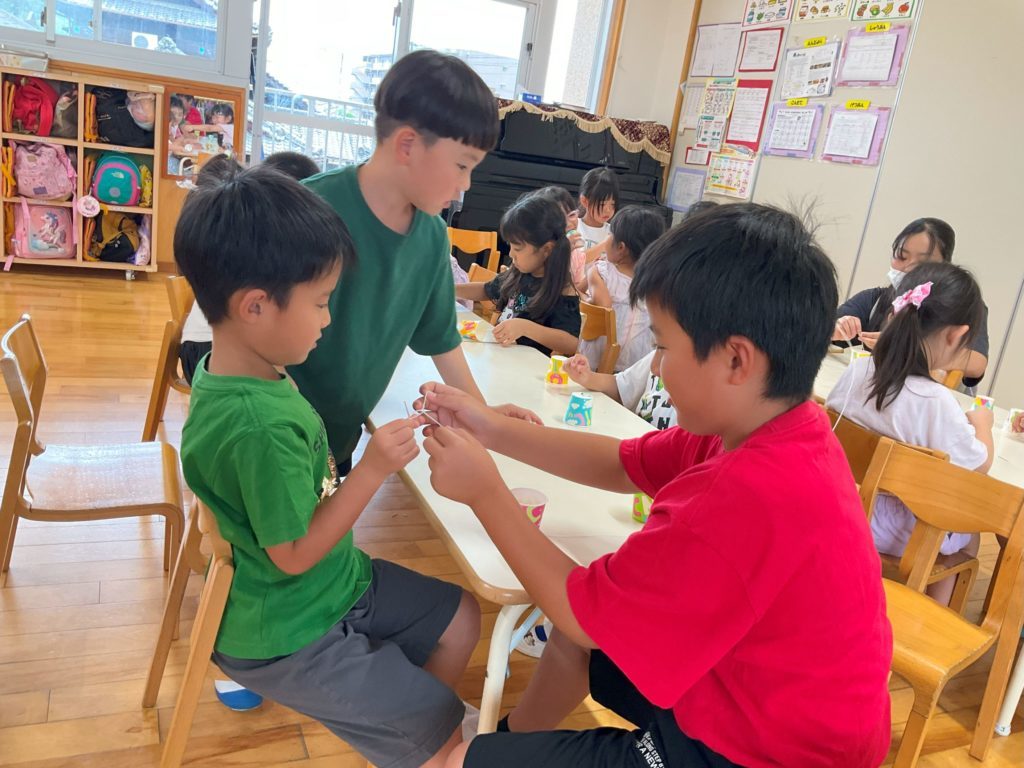 4・5歳児クラスでは、糸電話を作って遊びました。準備物を配ったり作り方を在園児さんに教えてくれたりと、「お姉ちゃん・お兄ちゃん教えて」と頼りにされ、小学生も嬉しそうに各テーブルを回って教えてくれていました。
