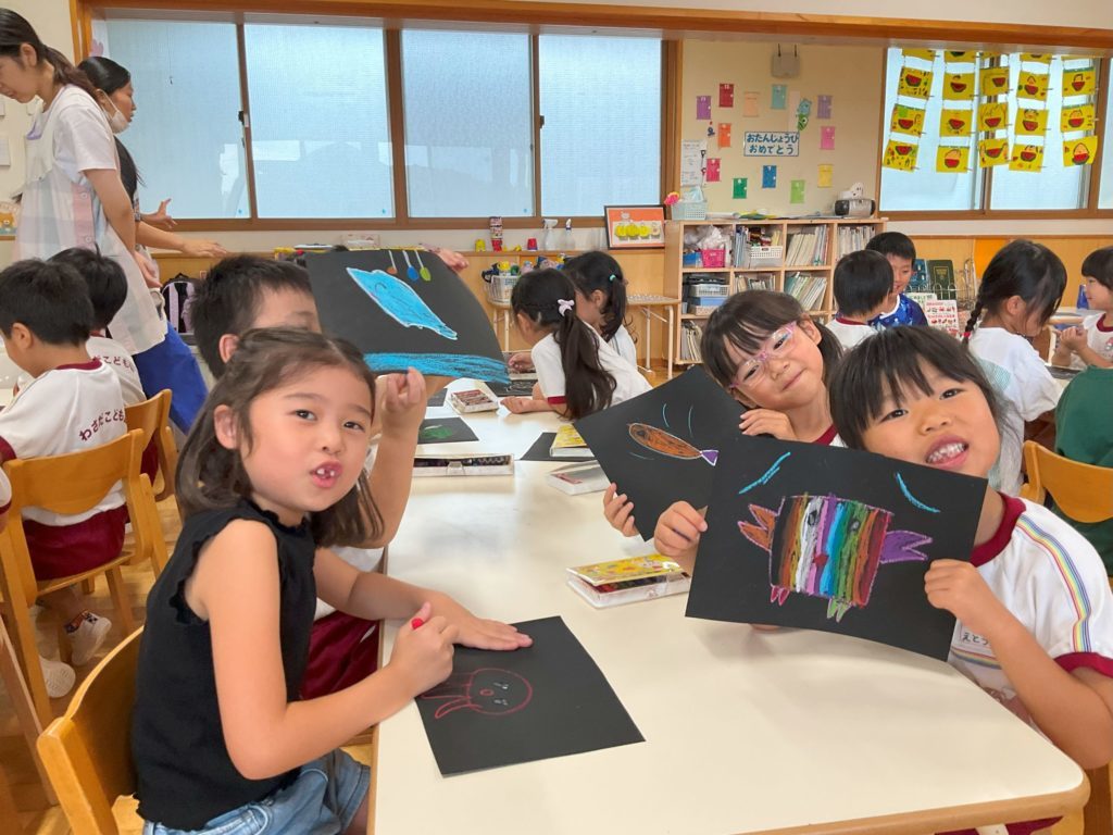 また、夏と言えば海!海の生き物はどんなものがいるのか皆で考え、画用紙にカニや魚・タコやカメなどを思い思いに描いていました。出来上がると「みてー♪」と見せ合う姿も見られました。最後は青いビニール袋で海を表現し、子ども達が描いた魚を泳がせ天井に飾りました。