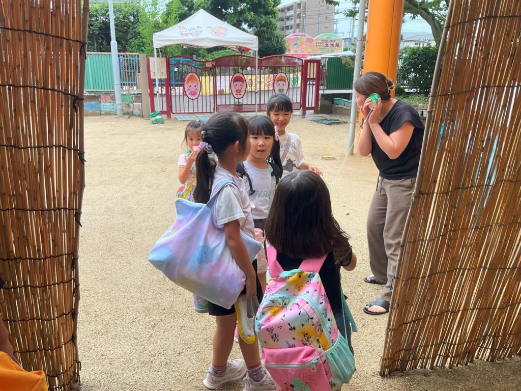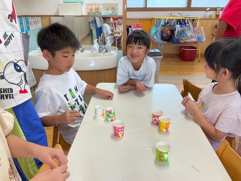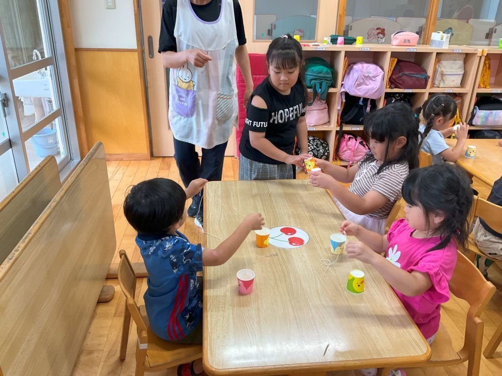 お迎えの際に今日作った糸電話で遊びながらお家の人と帰る姿にほっこりしました。