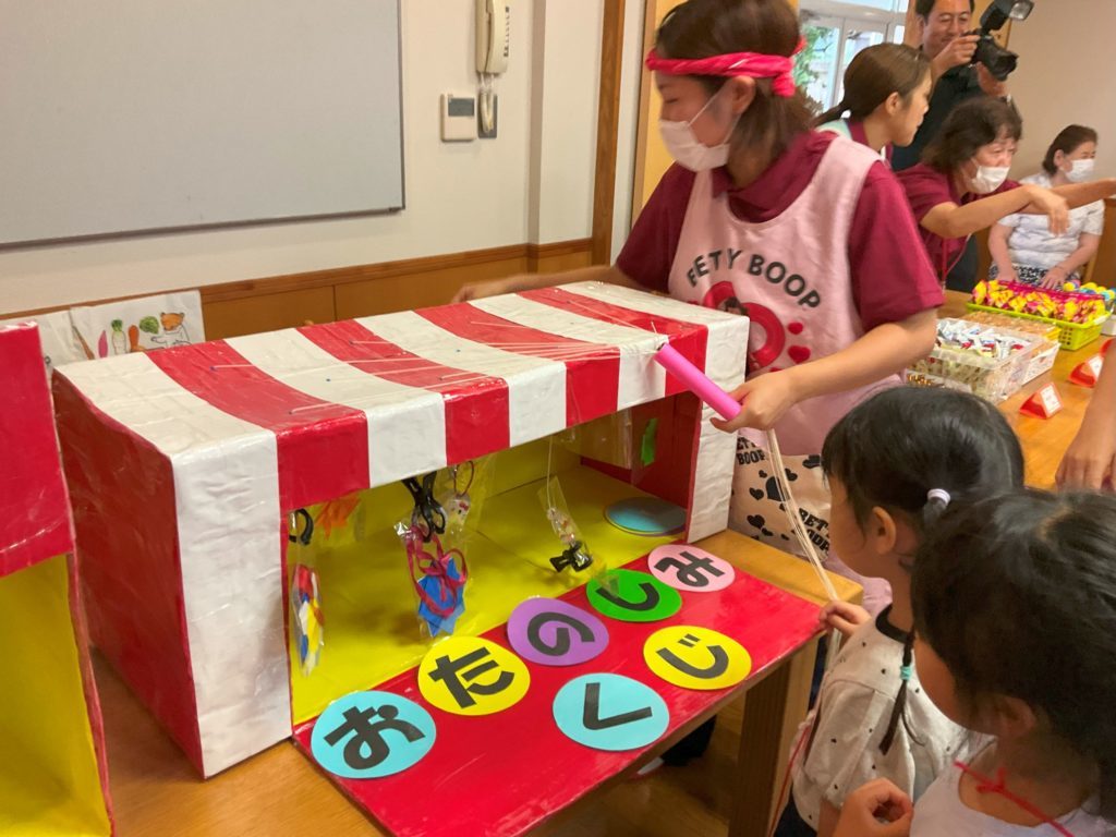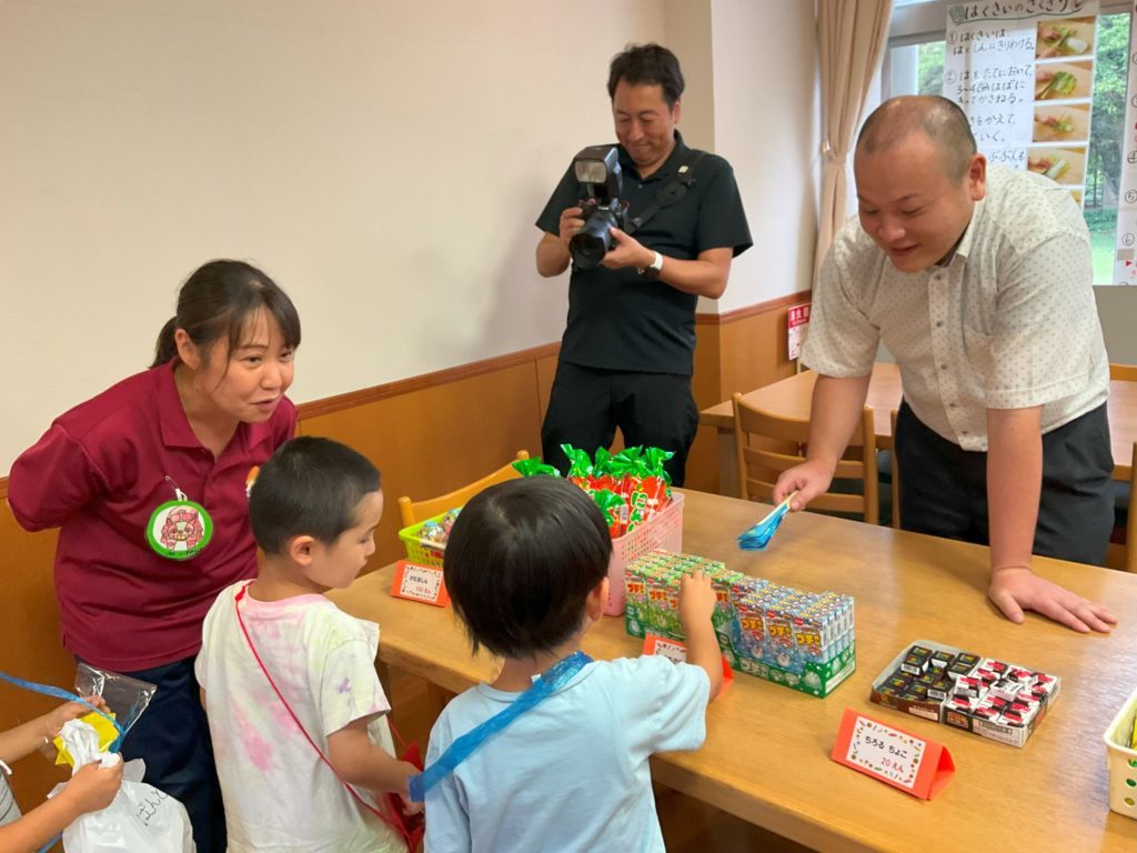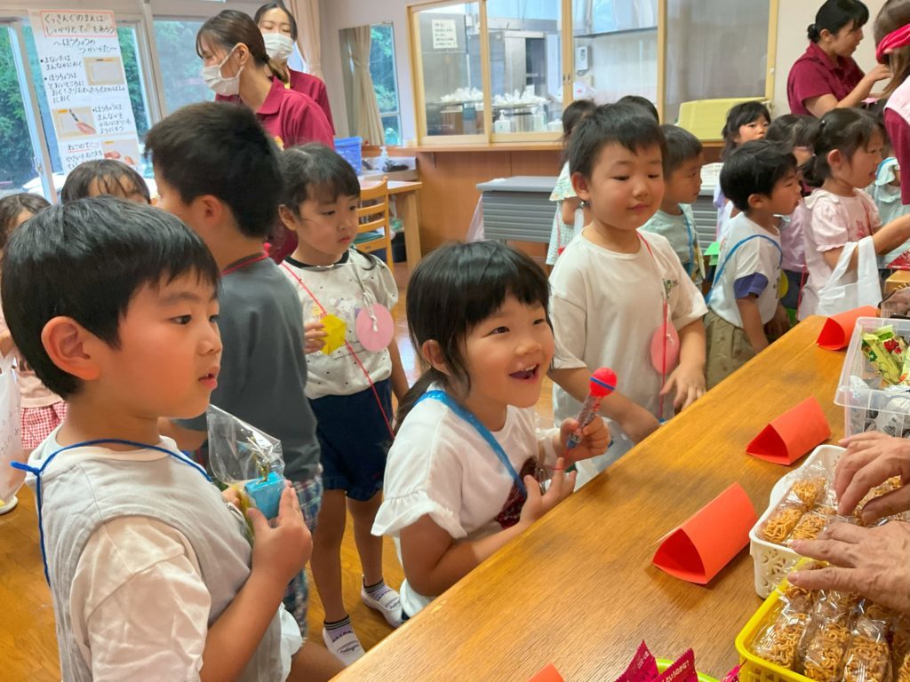 夕食前には駄菓子屋さんをしました。200円の手作りのお金とお財布を持っての参加です。「どれにしようかな」「まだかえる?」と友だちや先生と相談しながら好きなお菓子を買い、大事そうに鞄に直していました。