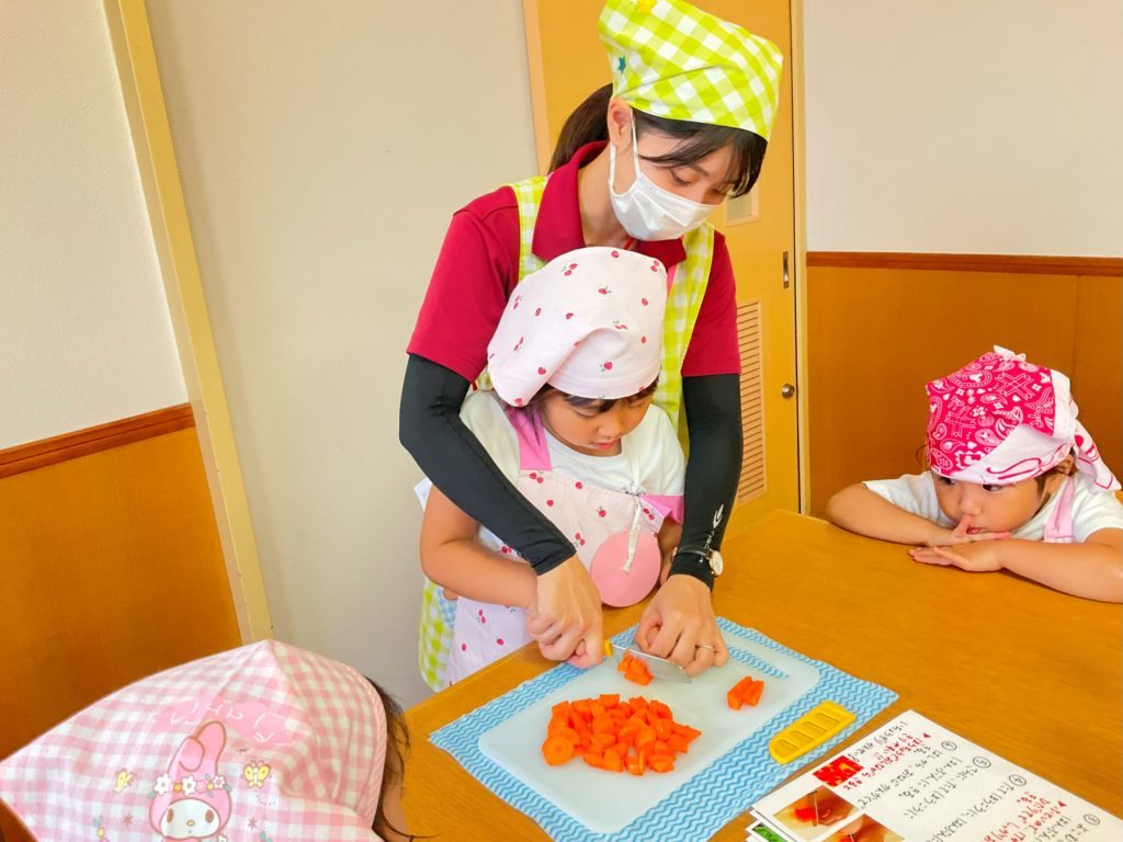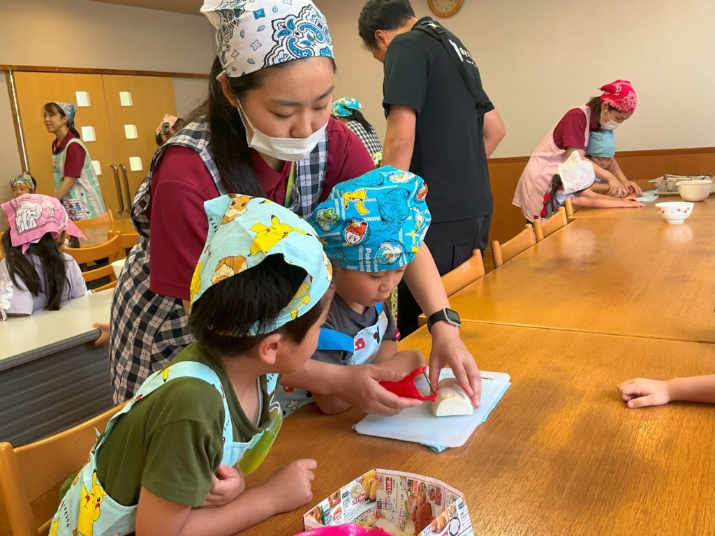 続いてそのままだんご汁作りです。包丁やピーラーの使い方に気を付けて、グループの先生や友だちと協力して野菜を切ったり、団子を伸ばしていました。野菜を切りながら「結構かたいな!」「はくさいは簡単に切れる」など野菜によって切りにくかったり、切りやすかったりと次のお友だちに気づいたことを伝えながらクッキングを楽しんでいた子ども達です。