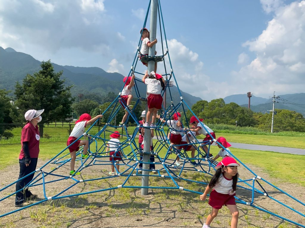 まず始めに行ったのは庄内カントリーパークです。遊んだことない遊具や虫(トンボやカマキリ・バッタやセミ等)もたくさんいて興味津々の子ども達。しっかり水分補給をし、遊ぶ時のお約束をした後は自分の好きな遊具へ向け走り出し元気に遊んでいました。「虫かごと虫網持ってくればよかった」と言いながら虫探しを楽しむ子・「なんか忍者修行みたい」と言って遊具のコースを決め、数人で並んで楽しくミッションクリアしたり、網のピラミットの頂上を目指し登ったり、シャボン玉で遊んだりと楽しい時間を過ごしました。途中日陰で棒アイスも食べ休憩もしました。