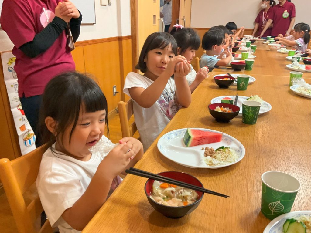 待ちに待った夕食の時間。夕食のだんご汁は「美味しい」とパクパクよく食べていました。