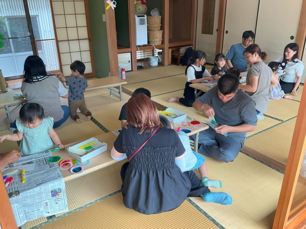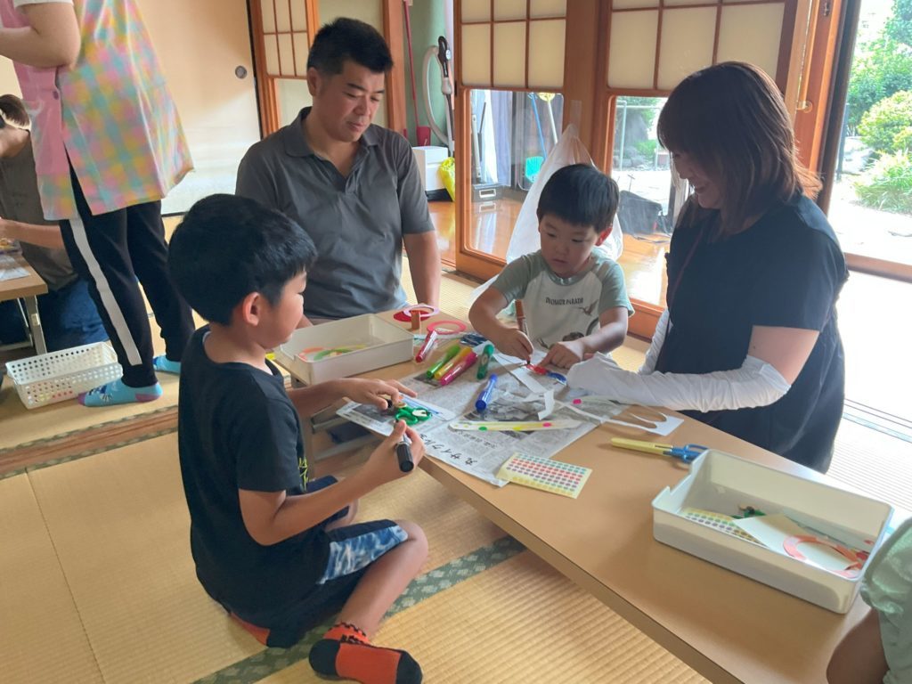 製作セットをもらうと、カラーセロハンに興味津々の子ども達。もらうとすぐに目に当て「わあー赤!」「私は黄色」と部屋を見回していました。親子で楽しくお話をしながらシールやマジックを使って貼ったり・模様を描いたりと楽しそうな姿がたくさん見られました。