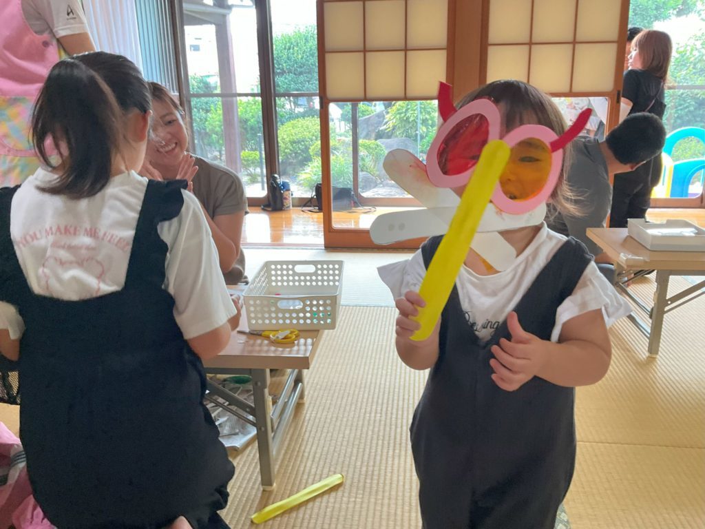 出来上がった「とんぼのメガネ」を目に当て、ピアノの「とんぼのメガネ」の曲に合わせて親子で部屋の中をお散歩しました。