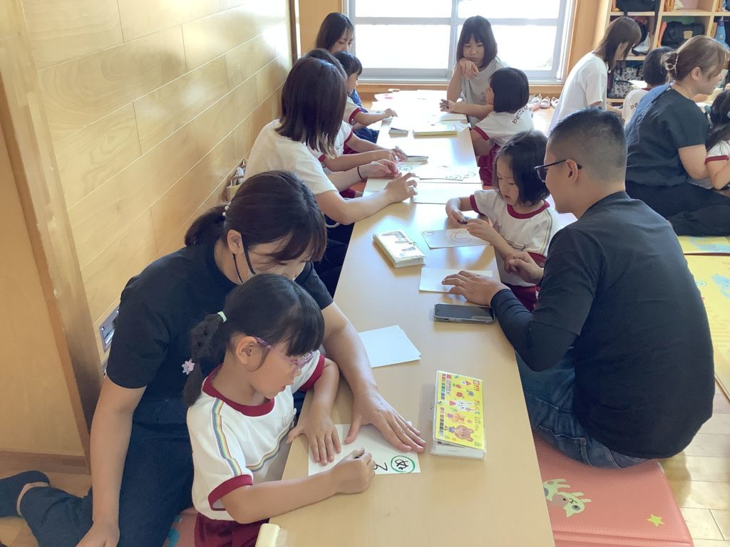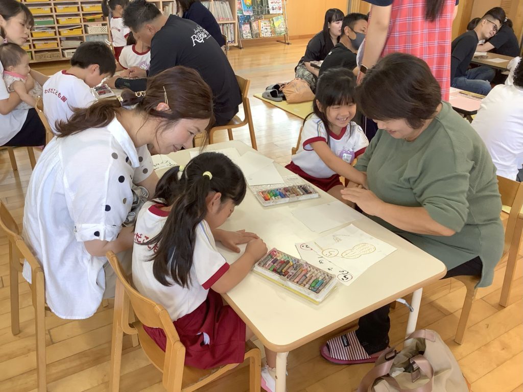 4歳児はお店屋さんごっこの品物作り、5歳児はかるた作りを保護者の方と一緒に行いました。