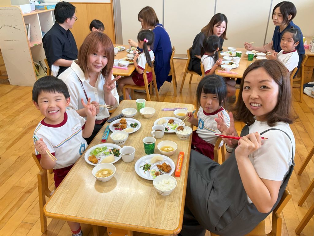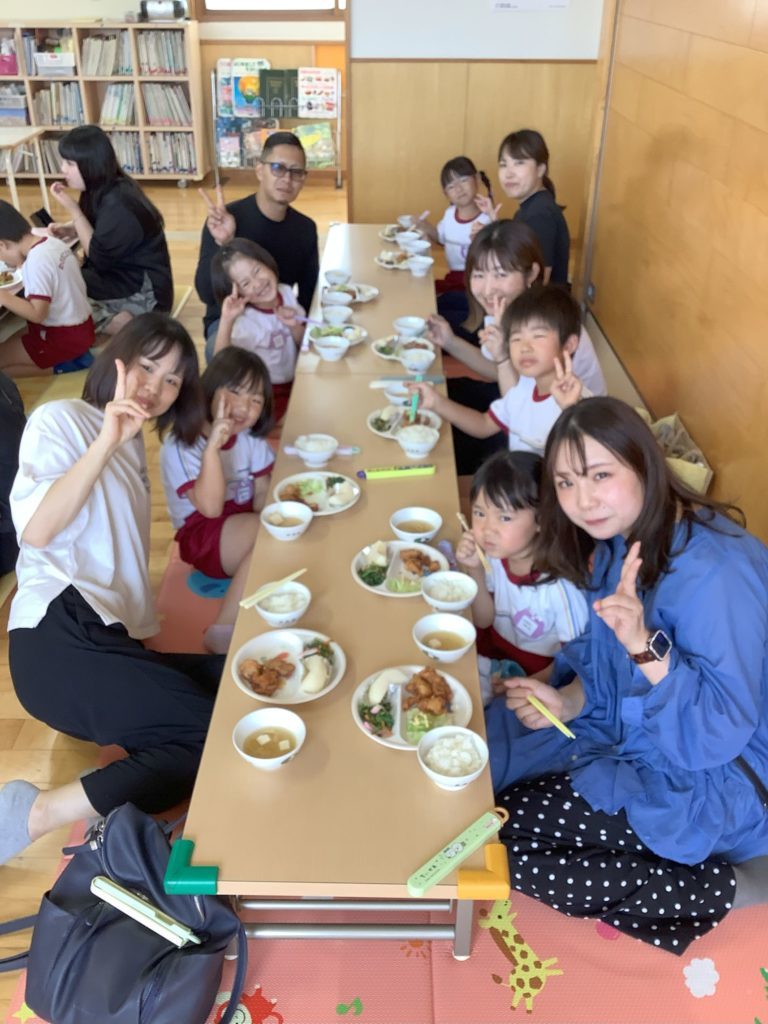 活動後には給食準備となり、いつもとは違い保護者の方も一緒に食べるということで、子どもたちも嬉しそうでした。
