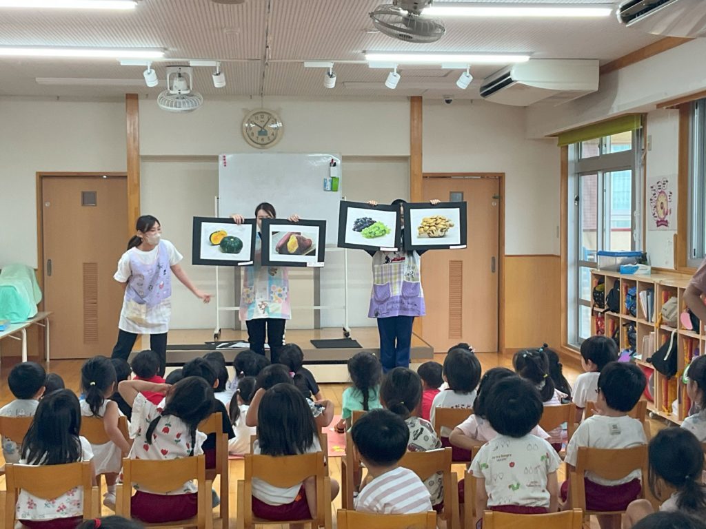 給食の際には『ぶどうじゃなかったー!!』と残念そうな声が聞こえてきましたが、今日 お話の中で聞いた野菜は『しめじ』でした。