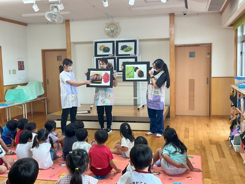 それぞれ、萩の花・牡丹の花にちなんで名づけられていることを教えてもらいました。今度、おやつにおはぎが出ることを知り、『楽しみ~!!食べたい!!』という声も聞こえてきました。
