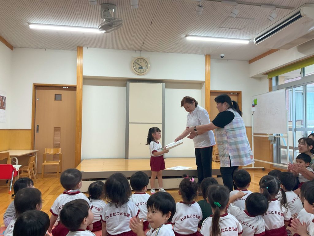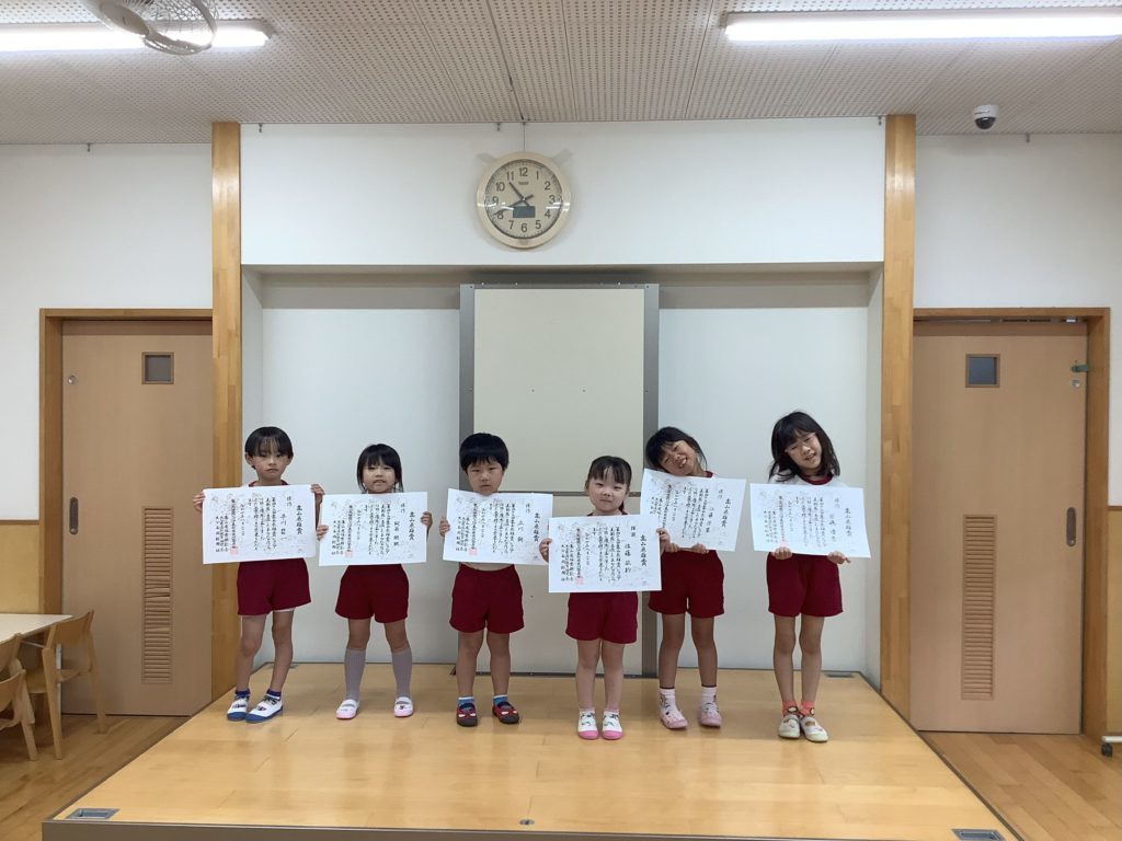 絵画コンクールの表彰式 めろん組、すいか組、ぶどう組合同で高山辰雄展の表彰を行いました。 賞に選ばれたお友だちはみんなの前で賞状と推奨をもらったお友だちはメダルをもらいました。皆の前に出たので少し緊張からか表情は硬かったですが、お友だちから「おめでとう」の拍手をたくさんもらい嬉しそうでした。 一覧へ戻る