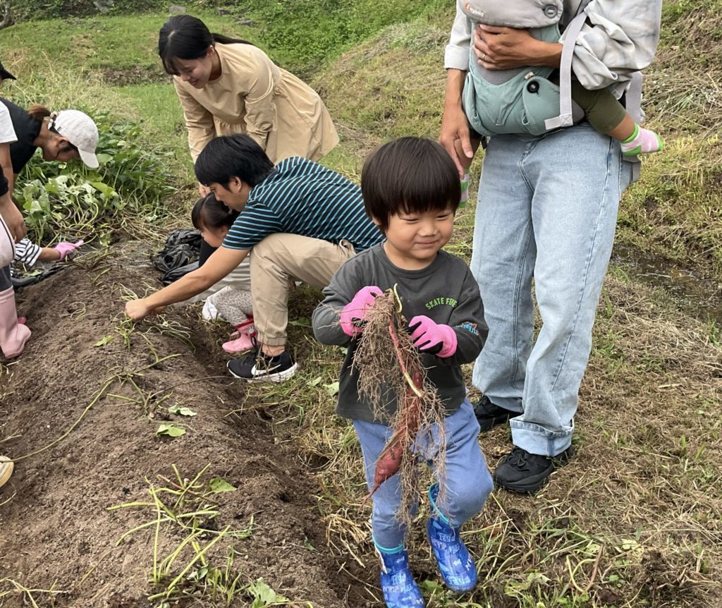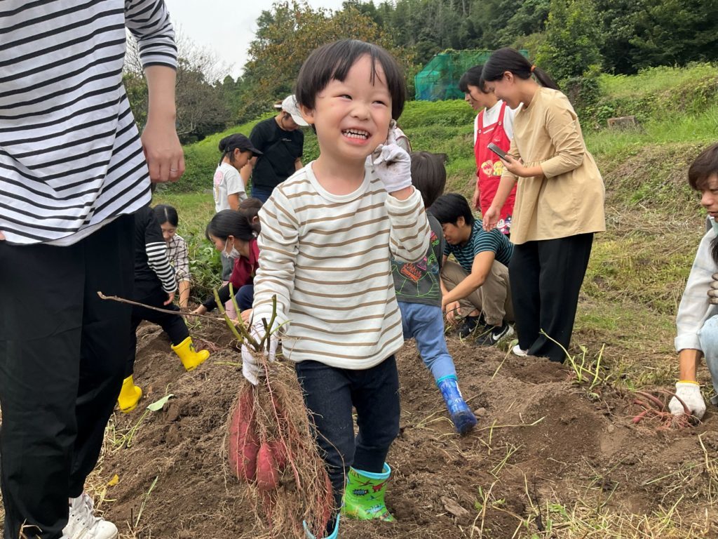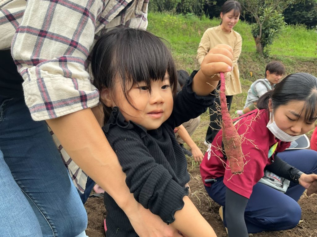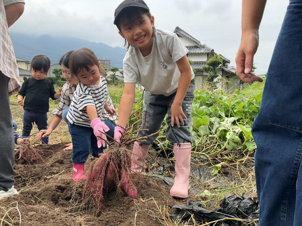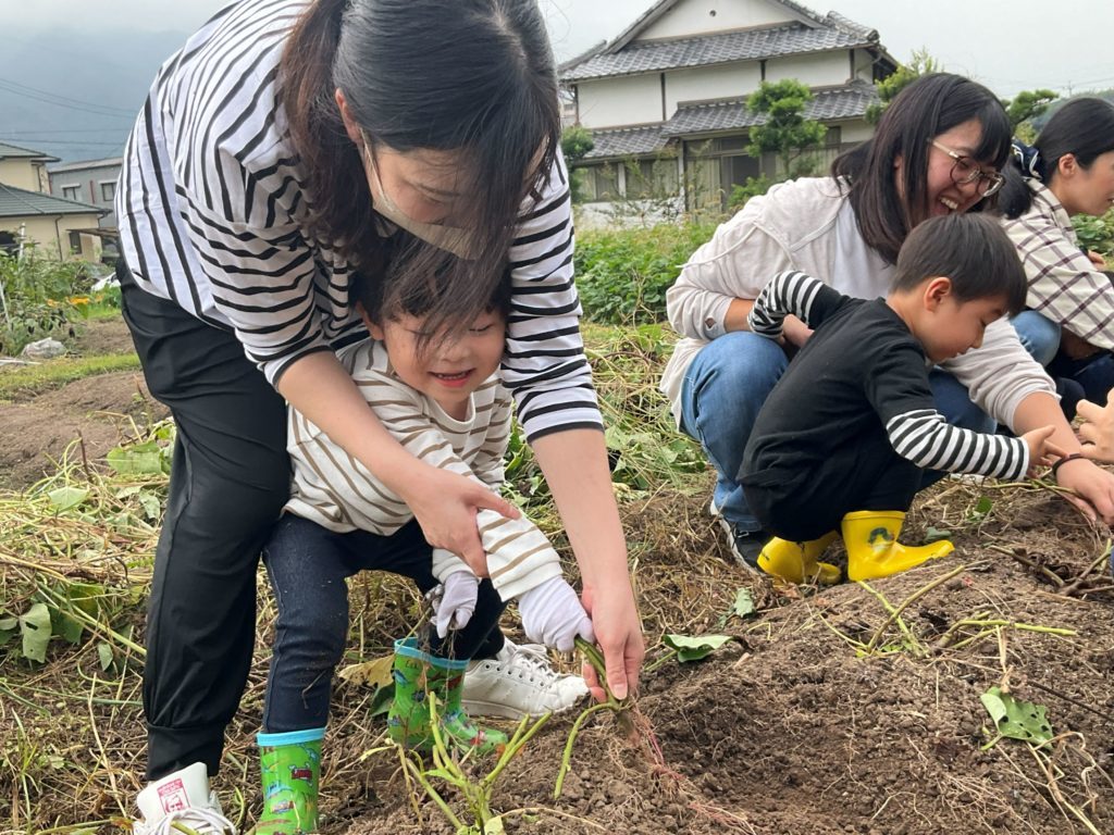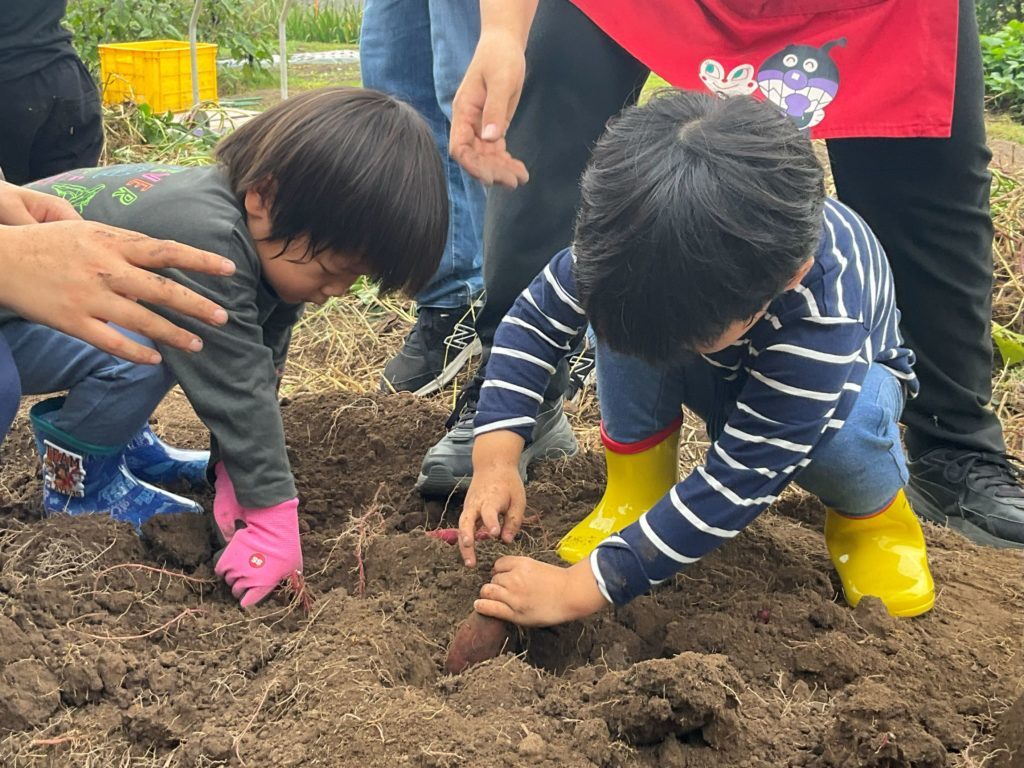腕まくりをして土を掘っていく子ども達。掘っているとミミズやダンゴムシを発見、虫を怖がることなく掘り進めついにお芋発見!