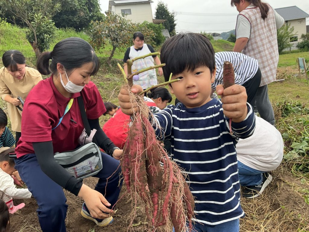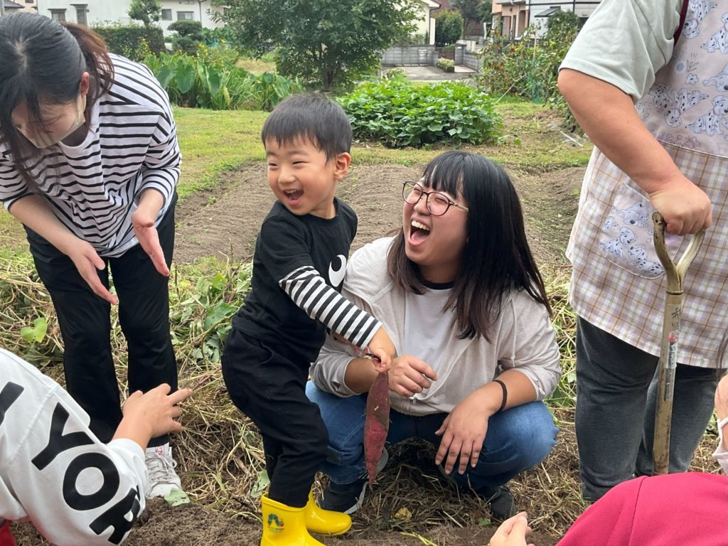 収穫したお芋と一緒に記念写真をとり、お芋もプレゼントで持って帰ります。頑張ってとったお芋は美味しいよ♪