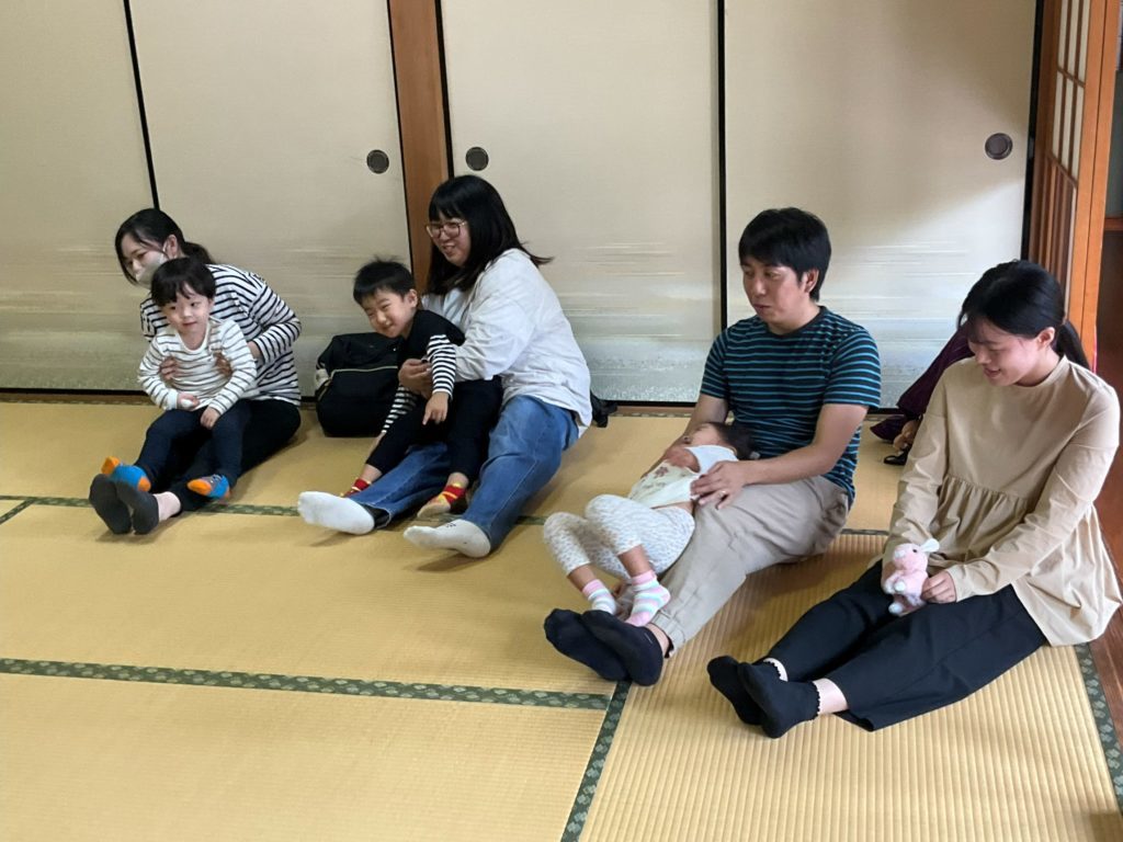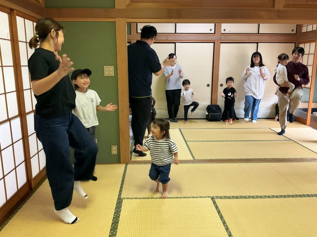 その後は体操「エビカニクス」「ちょっとだけ体操」・触れ合い遊び「もみもみもみじ」「バスにのって」を親子で楽しみました。