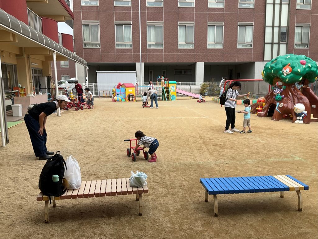 園で手を洗った後は園庭で遊びました。仲良くおもちゃを一緒に使いながら遊ぶ事が出来ていました。