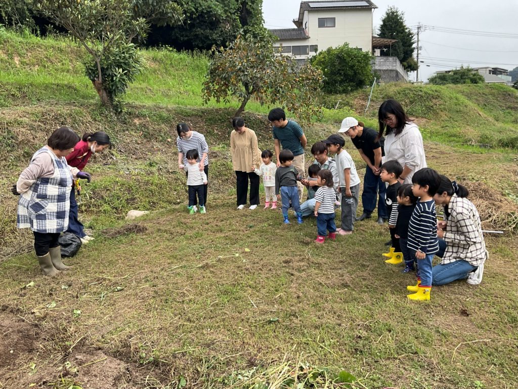 畑に到着!畑のお世話をしてくれている衛藤先生に皆でご挨拶をして芋ほりスタート!