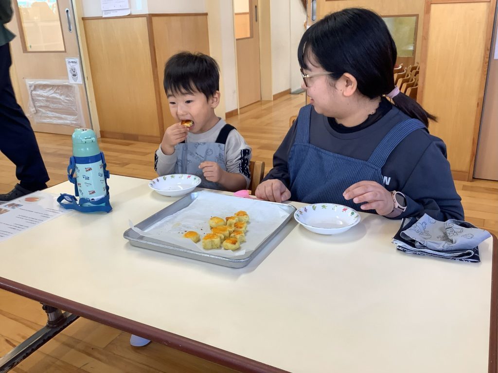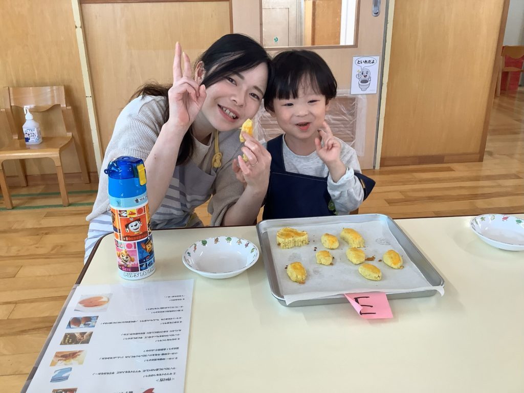最後に卵黄を塗って完成です!「おいしくなーれ!」「スイートポテトにお化粧しよう♪」と話しながら塗っていました。