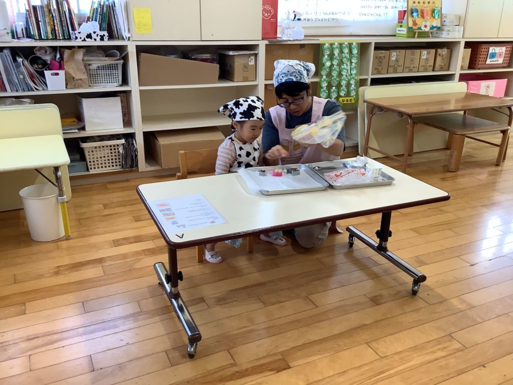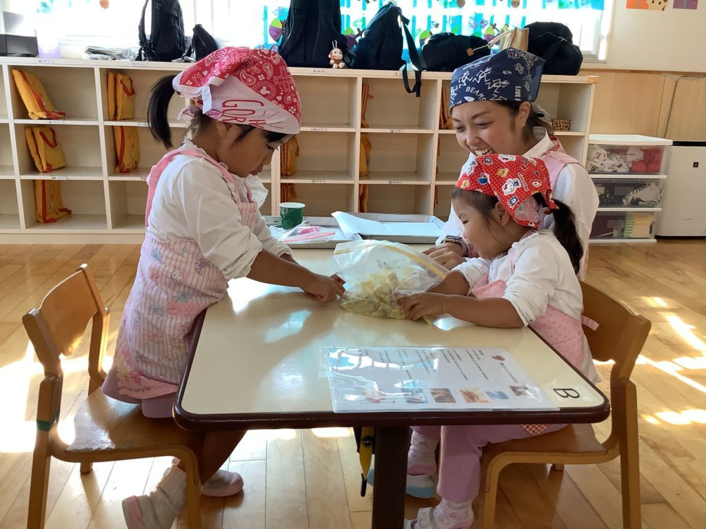 お話の後は親子でエプロン・三角巾を付け、手を洗い準備OK!いよいよクッキングスタートです。