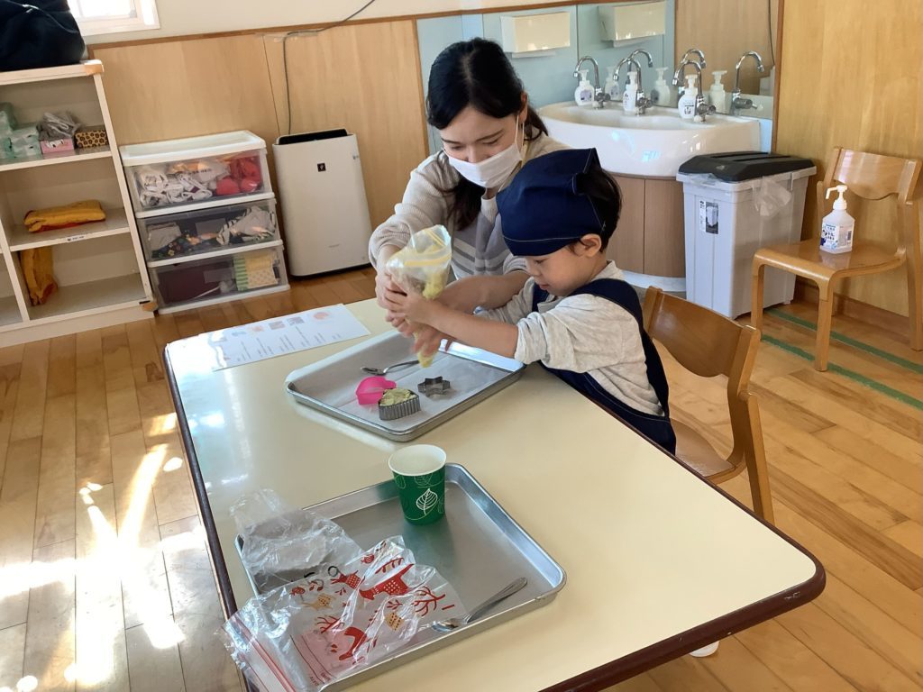 つぶし終わったら次は、形成です!ジップロックの端を少し切り、サツマイモをを絞り出しながら、型に入れたり・手のひらに乗せ丸めたりと各家庭で色んな形のスイートポテトが出来上がっていました。