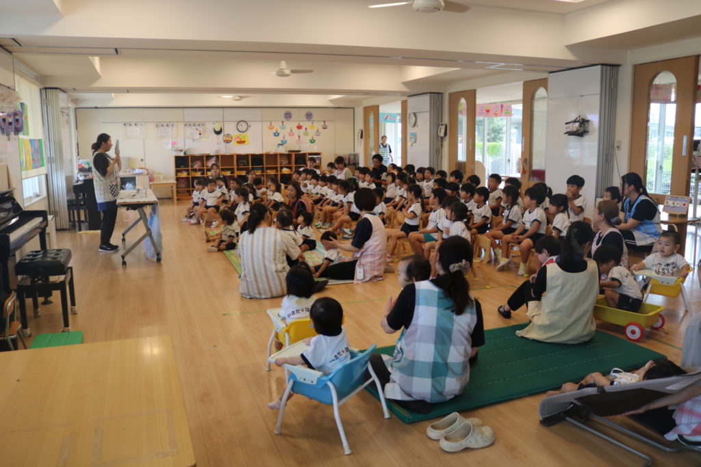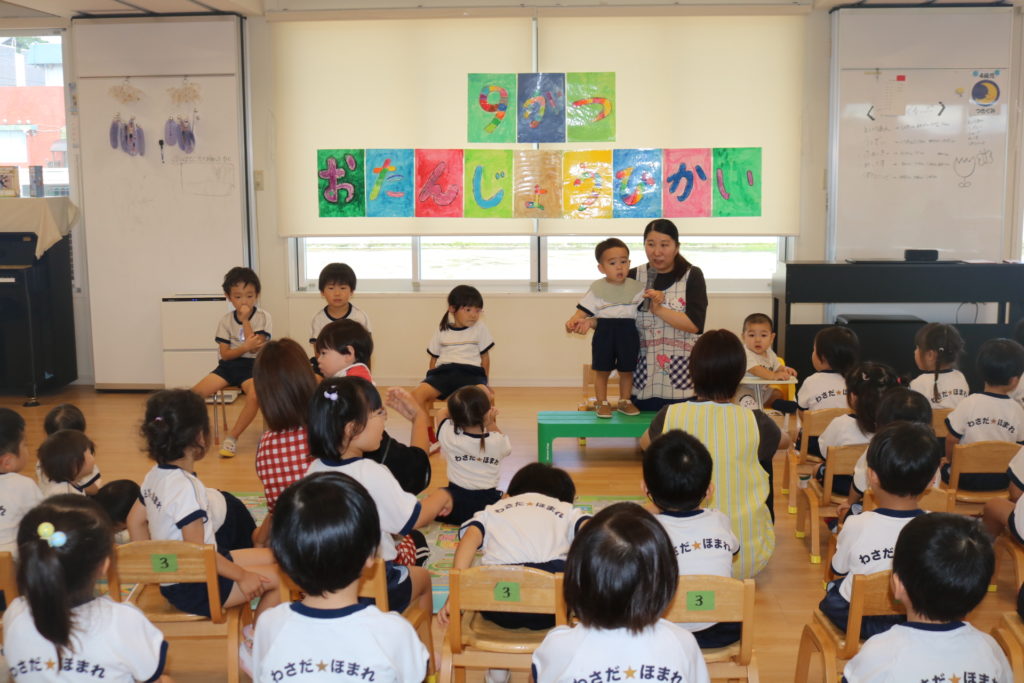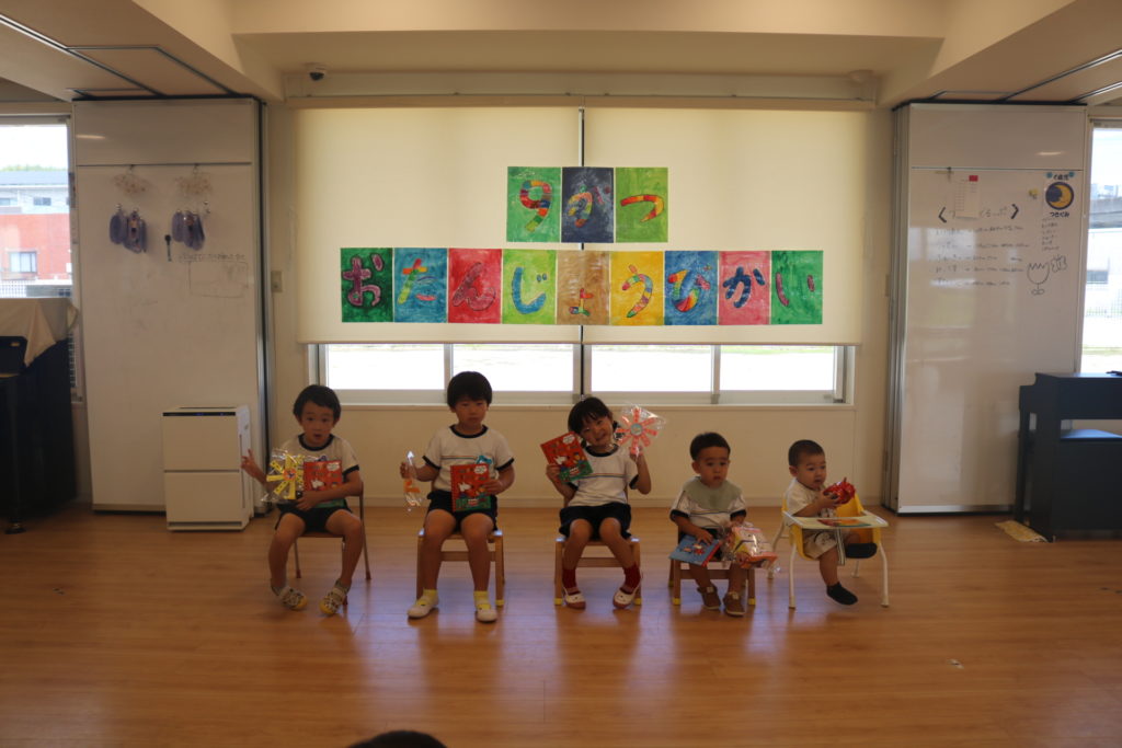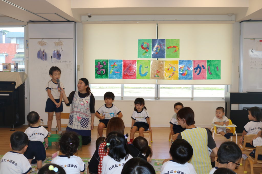 9月の誕生日会です。手作りの玩具のプレゼントや担任の先生からのお祝いメッセージをもらい、そして皆からのお祝いの言葉をもらい、とっても嬉しそうにしていた子ども達です。子ども達からの「好きな食べ物はなんですか?」などの質問なども元気よく答えていました!秋の風物詩のお月見や秋の食についてのお話を楽しくしてくれ、皆で楽しく参加する事が出来ました。またひとつ大きくなったお友達!これからも、いっぱ食べてたくさん遊んで、すくすくと大きくなってね♥