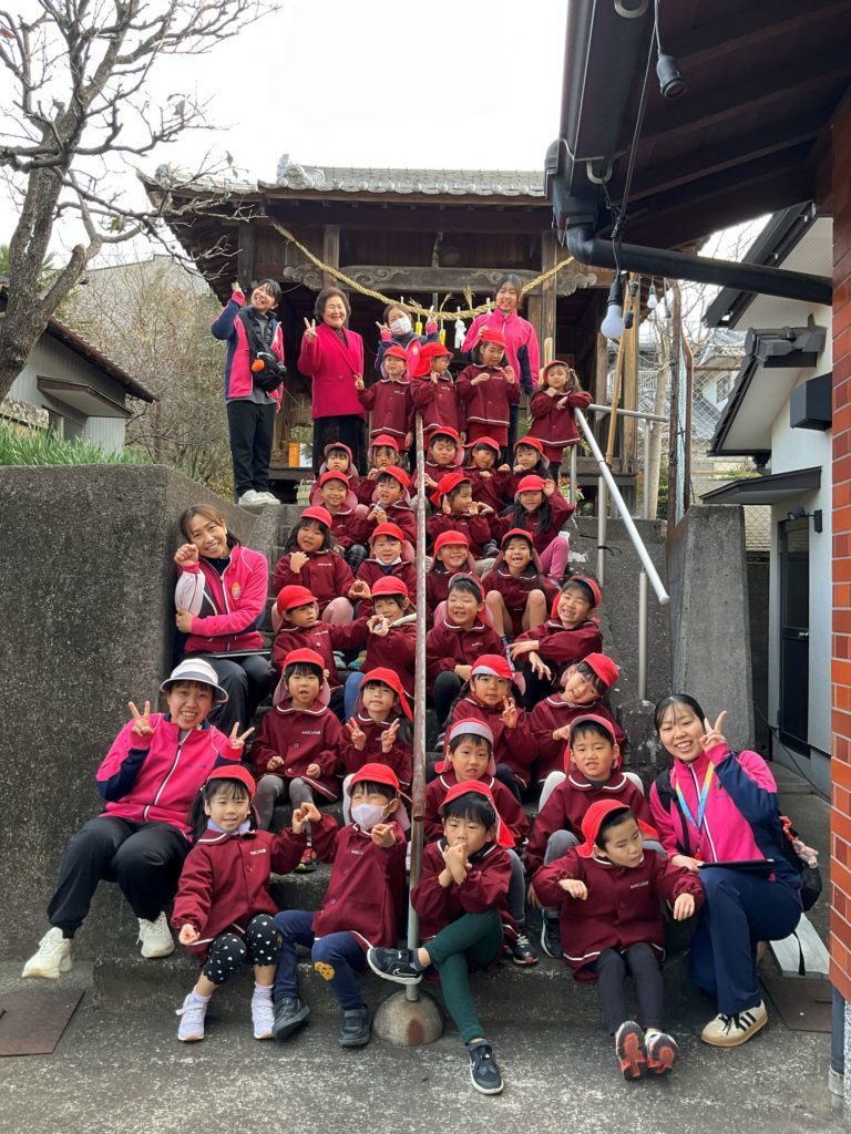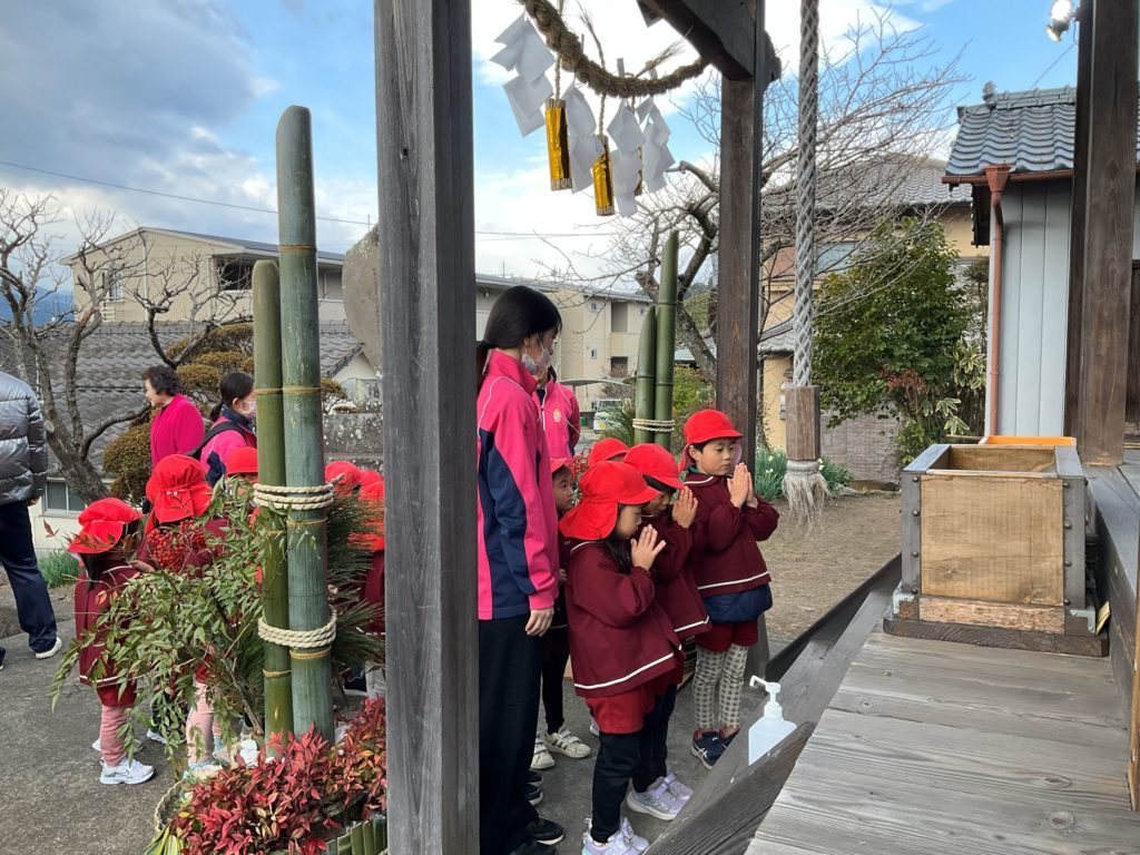 初詣 新しい年を迎え、1月5日(月)に4.5歳児の子ども達と近所の氏神様にお参りに行ってきました。神社に行く途中、「ここ行ったことある」と去年行ったことを覚えていて教えてくれました。 園長先生が先にお参りするのをよく見ていた子ども達。お賽銭を入れて二礼二拍手一礼をして、神様に新年のご挨拶とお願い事を出来ていました。 今年も怪我なく病気をせずに元気に友だちと楽しく過ごせますように♪ 一覧へ戻る