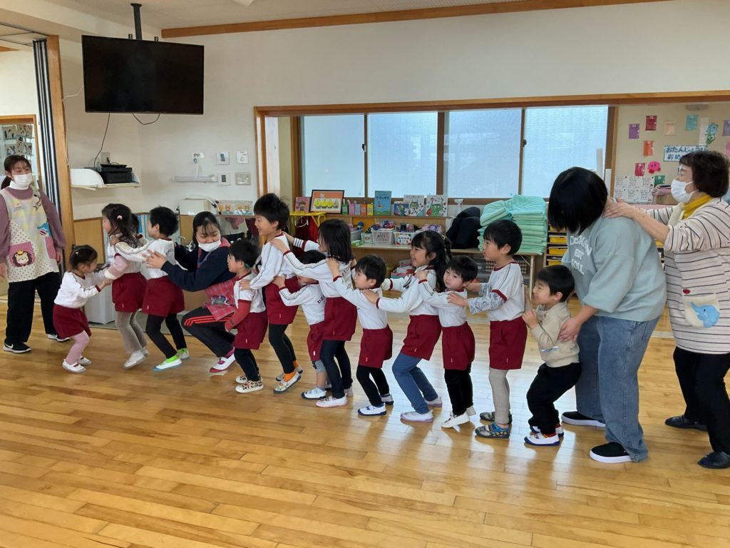 体操の後は、触れ合い遊びで『モンスター列車』をしました。列車を作り、在園児さんも前の人にこちょこちょしたり・ツンツンしたりしながら参加者さんと一緒に触れ合っていました。