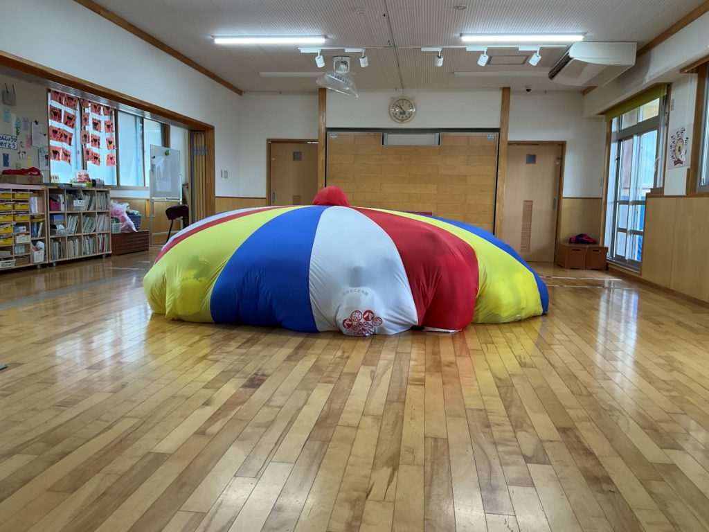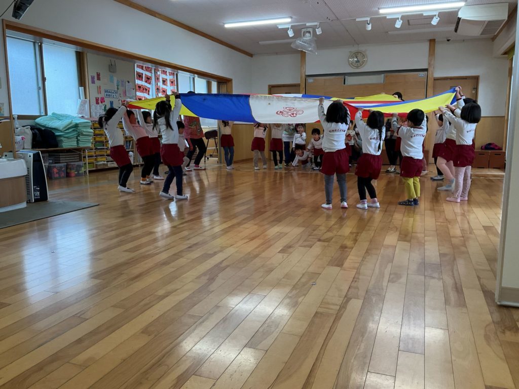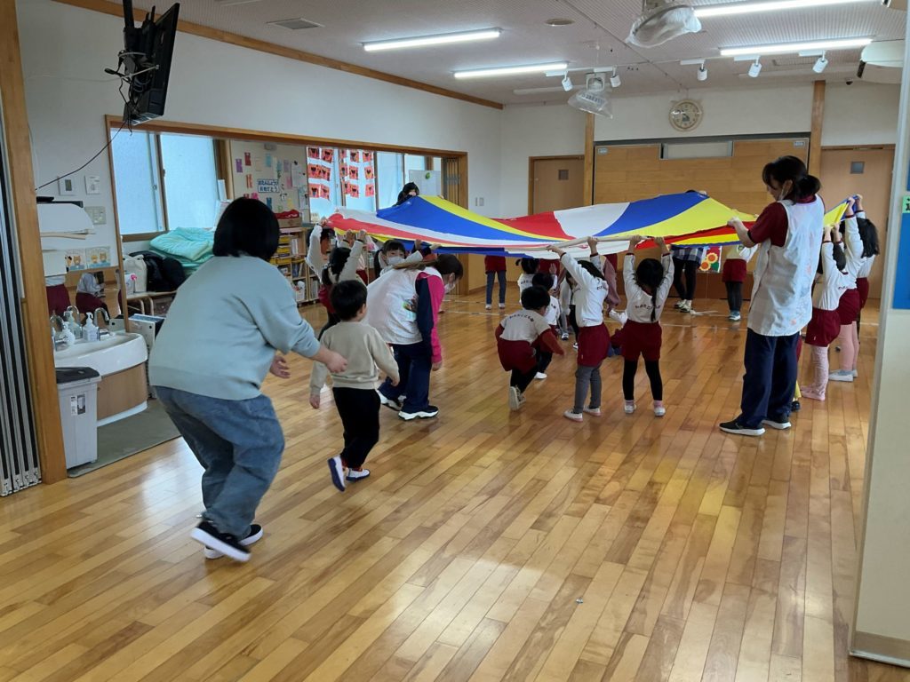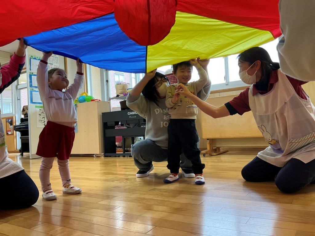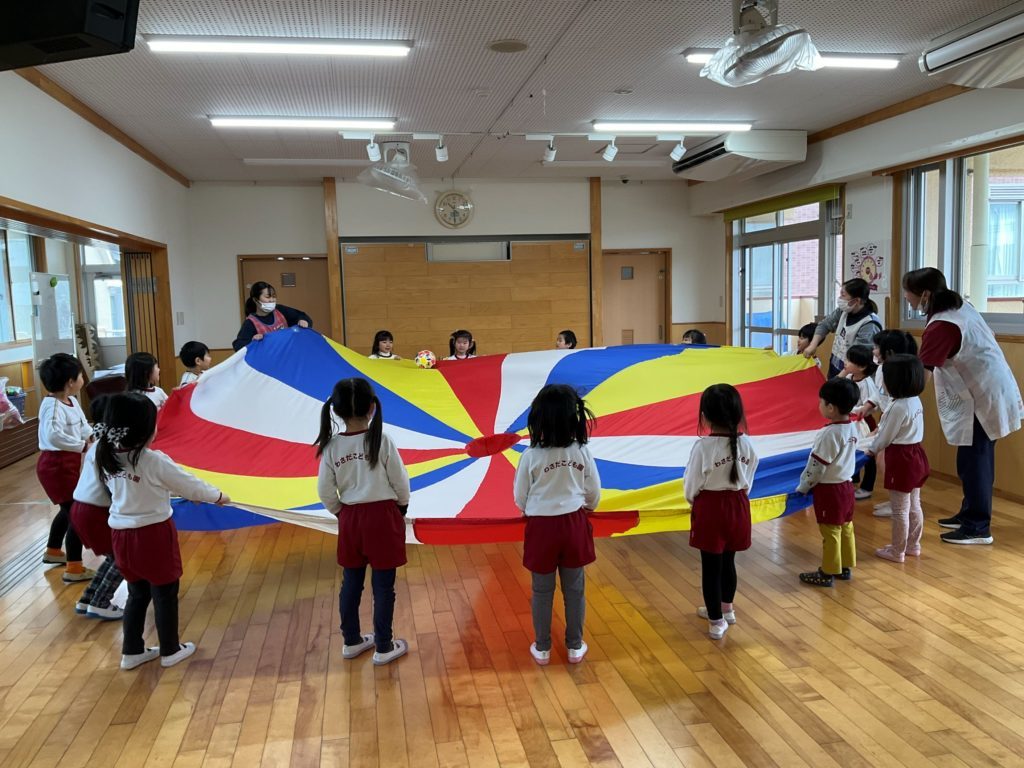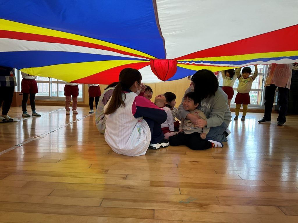 今回は『パラバルーンを使って親子で運動遊びを楽しもう』をテーマに参加者さんと在園児の2.4.5歳児さんも一緒に遊びました。