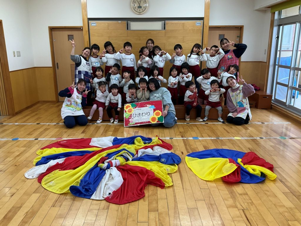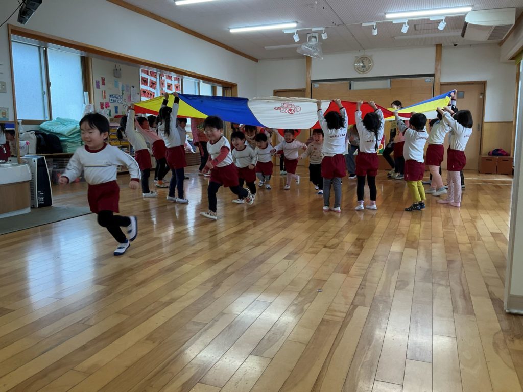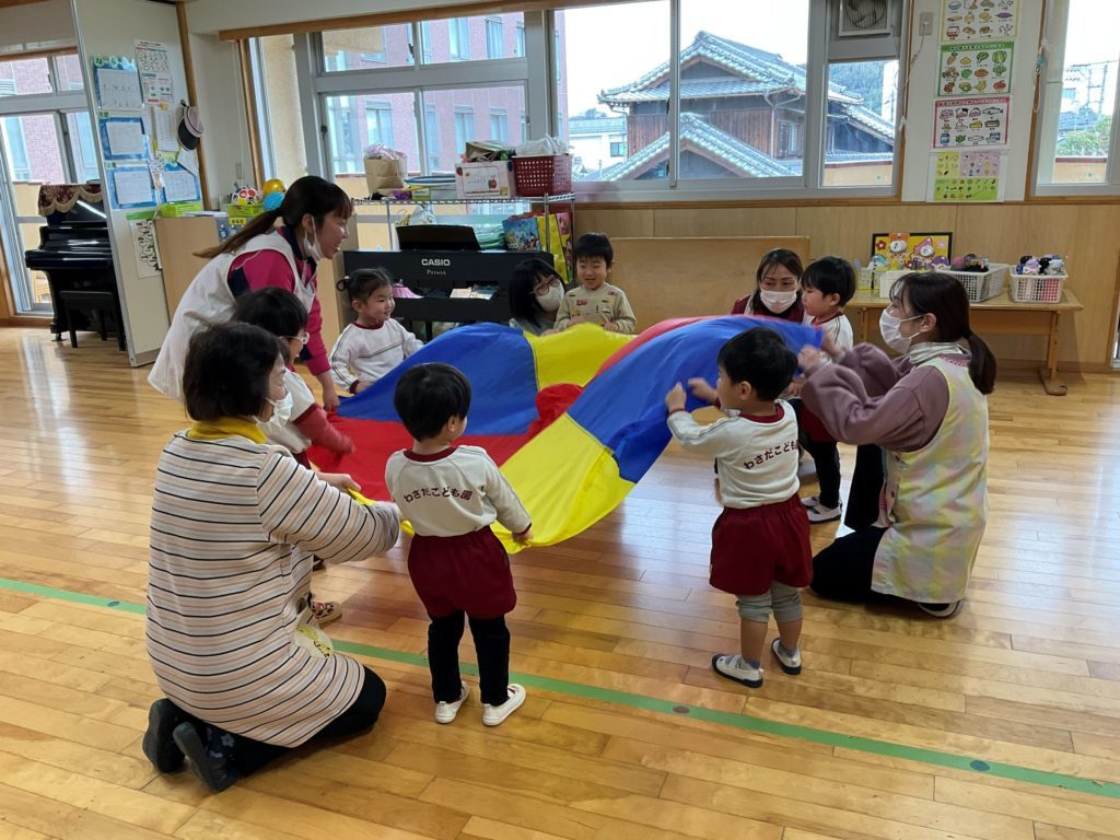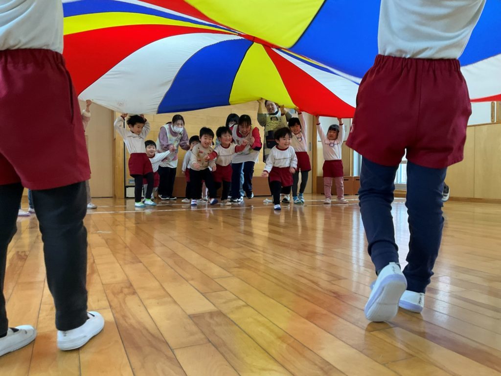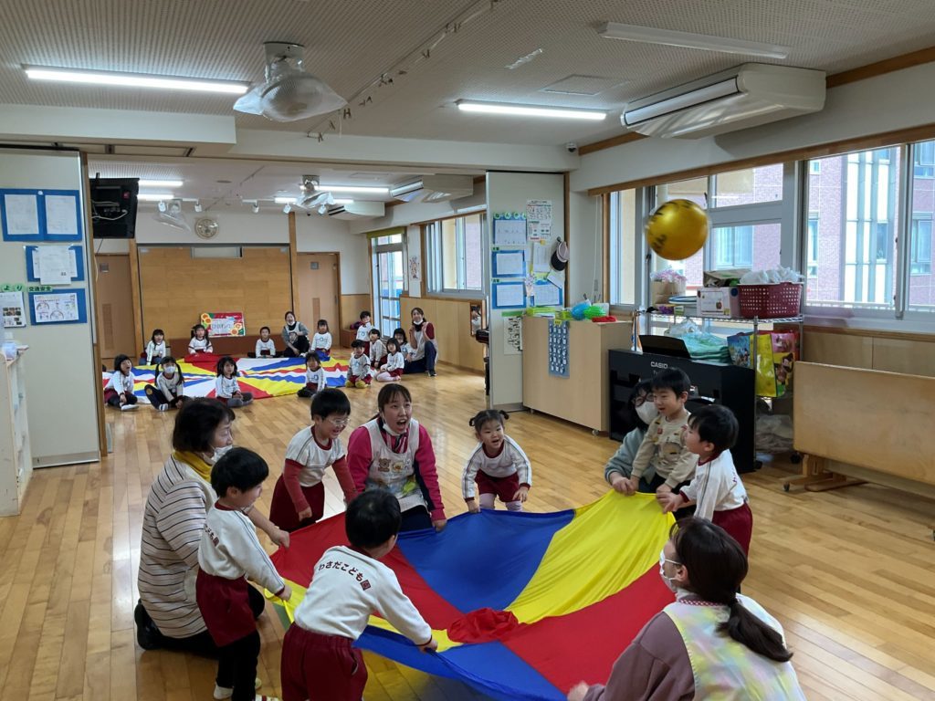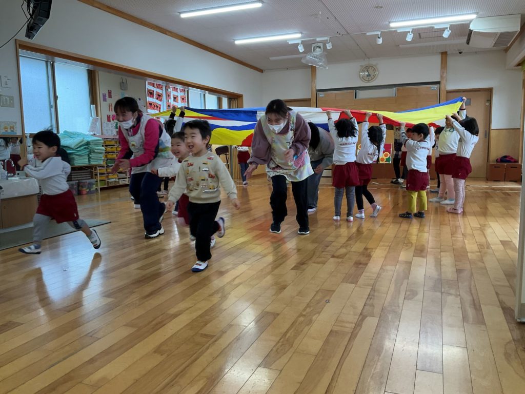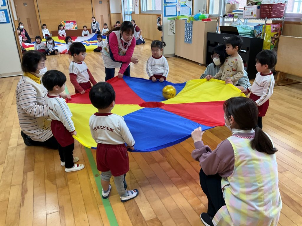 今回は『パラバルーンを使って親子で運動遊びを楽しもう』をテーマに参加者さんと在園児の2.4.5歳児さんも一緒に遊びました。